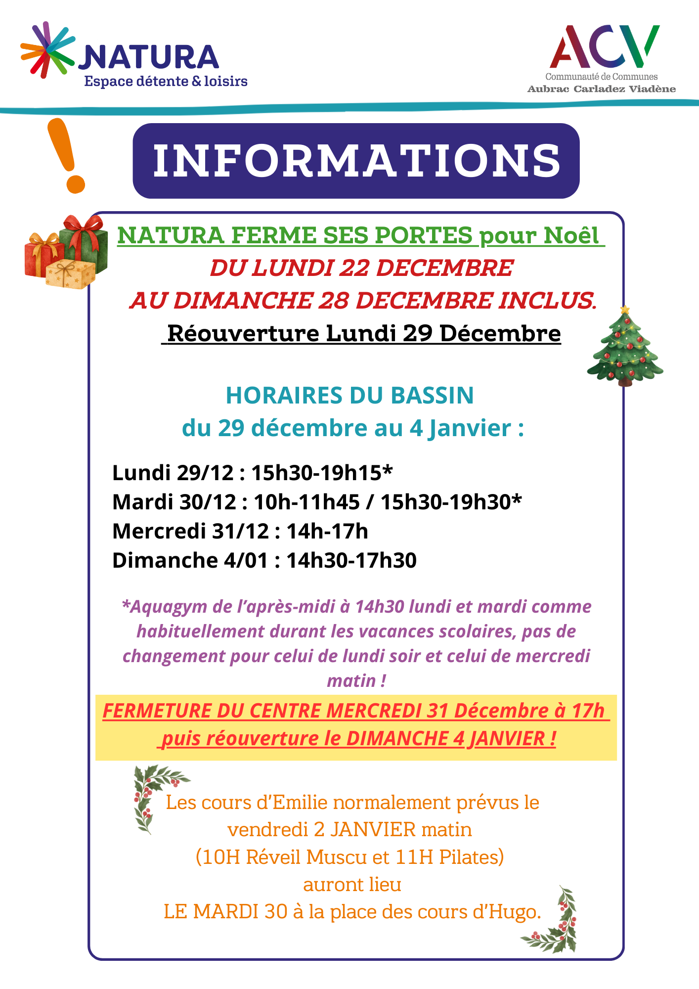 Natura ferme ses portes du lundi 22 décembre au dimanche 28 décembre inclus et le 01 janvier.